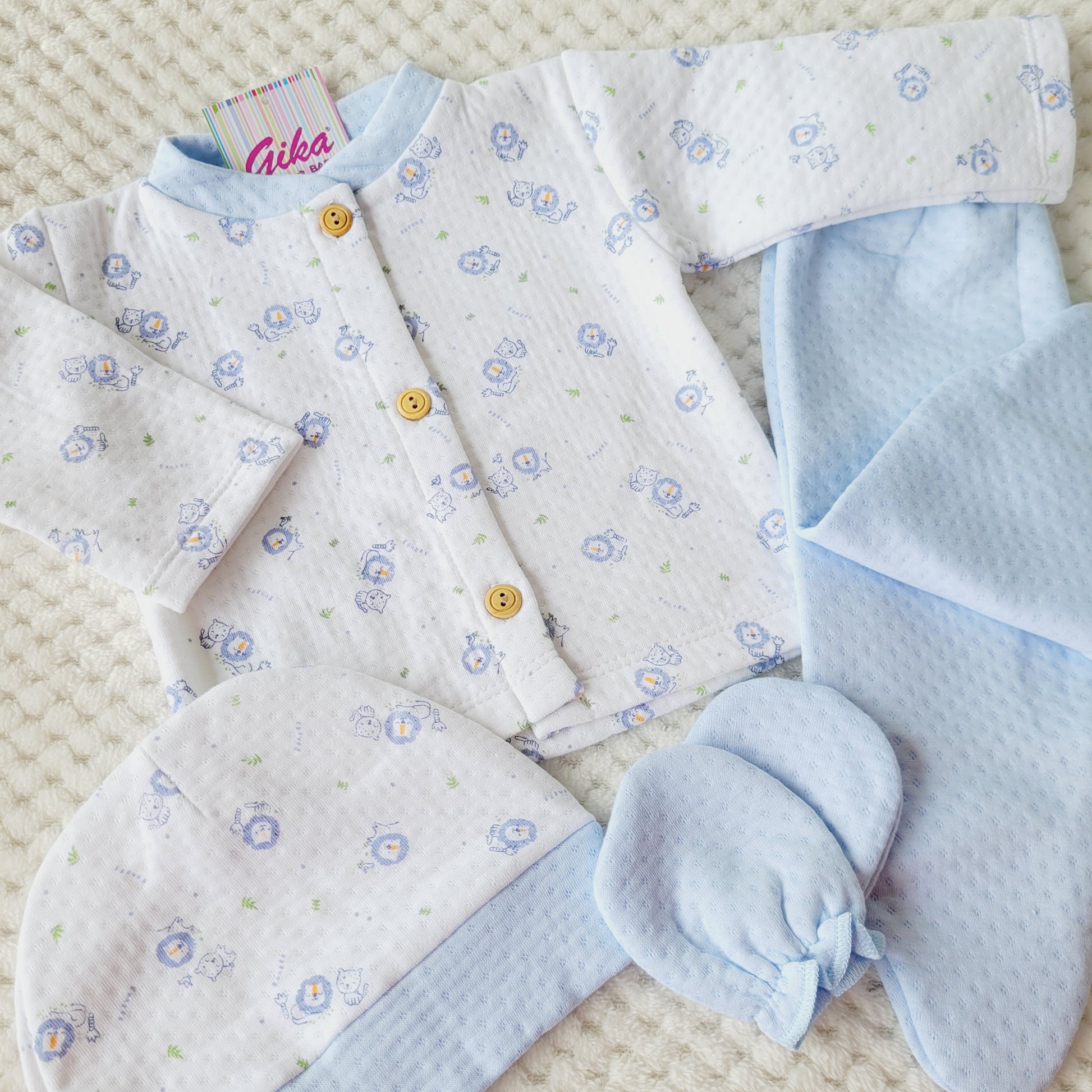 Tu bebit@ súper cómod@ y abrigadit@ con este hermoso ajuar en algodón jacquard, ideal para esta temporada.